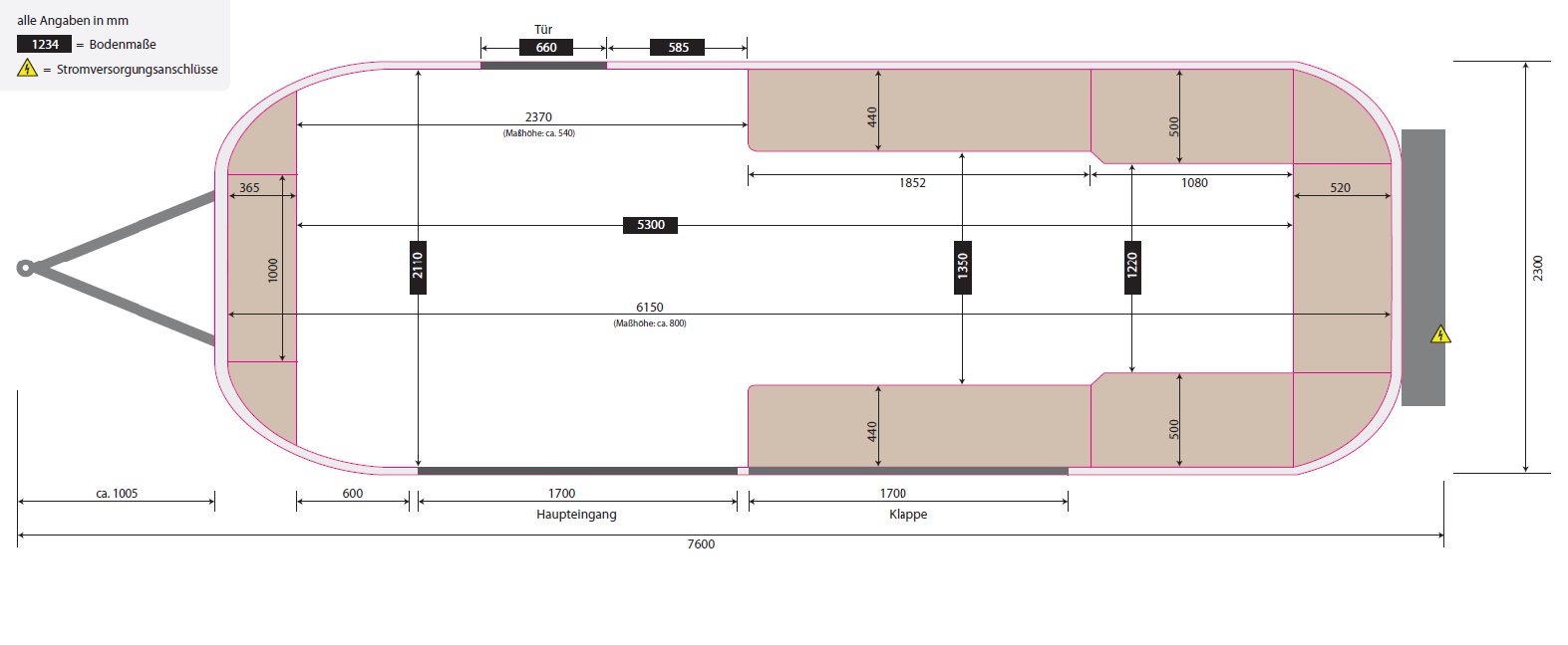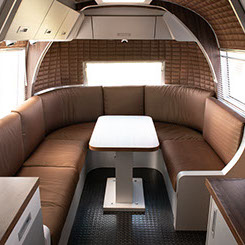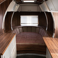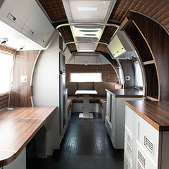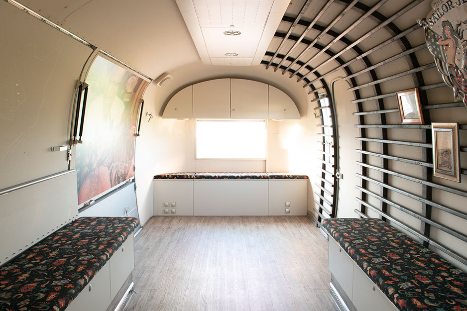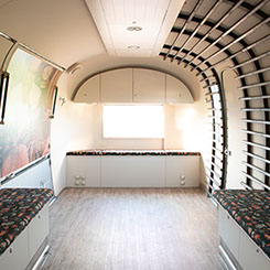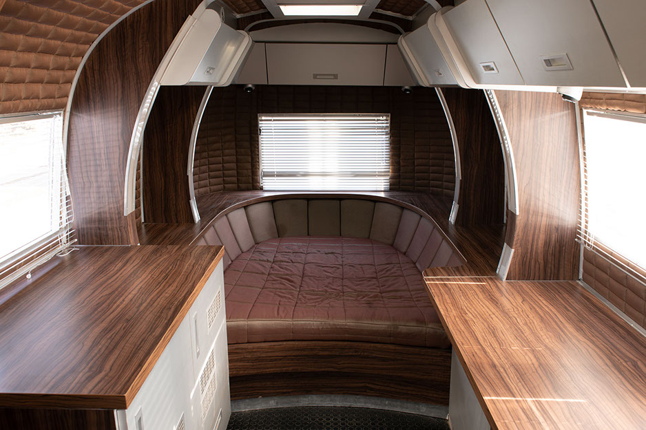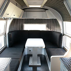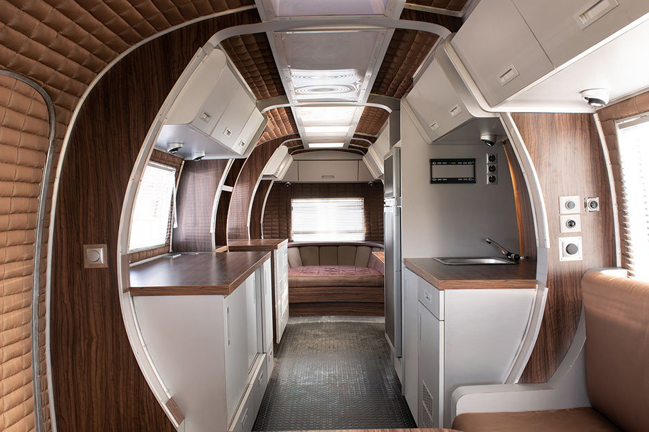 Jednodvéřový karavan vhodný jako mobilní kancelář, stylové zázemí na výstavách a road show. V pravé části sezení okolo stolu na sedačce, ve střední a levé části je k dispozici kuchyňka a pracovní stoly se sezením na židlích. Interiér je v kombinaci hnědé a stříbrné. Vyroben 1971, přestavěn 2008.